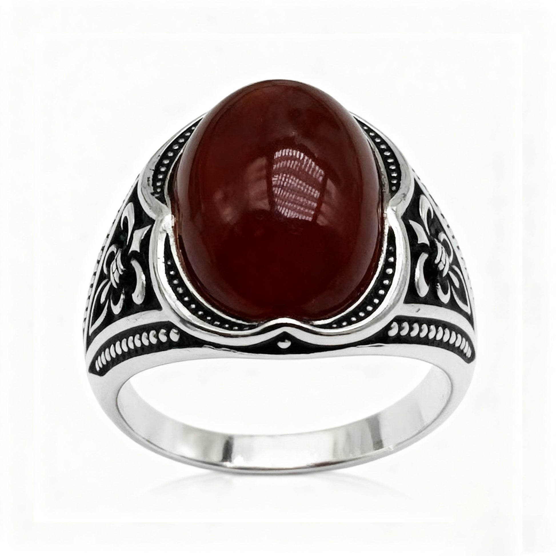 Enhance your style with our 925 Silver Vintage Style Ring for Men, featuring a striking red agate stone set in an exquisitely patterned band. Rhodium plating adds extra shine and durability, making it a long-lasting piece of fine jewelry. Perfect as a gift or a statement accessory, this ring blends vintage charm with modern elegance.